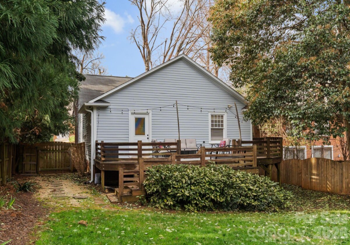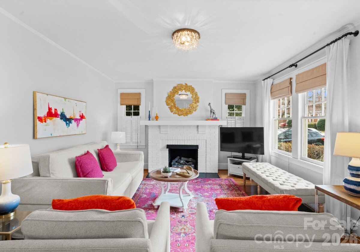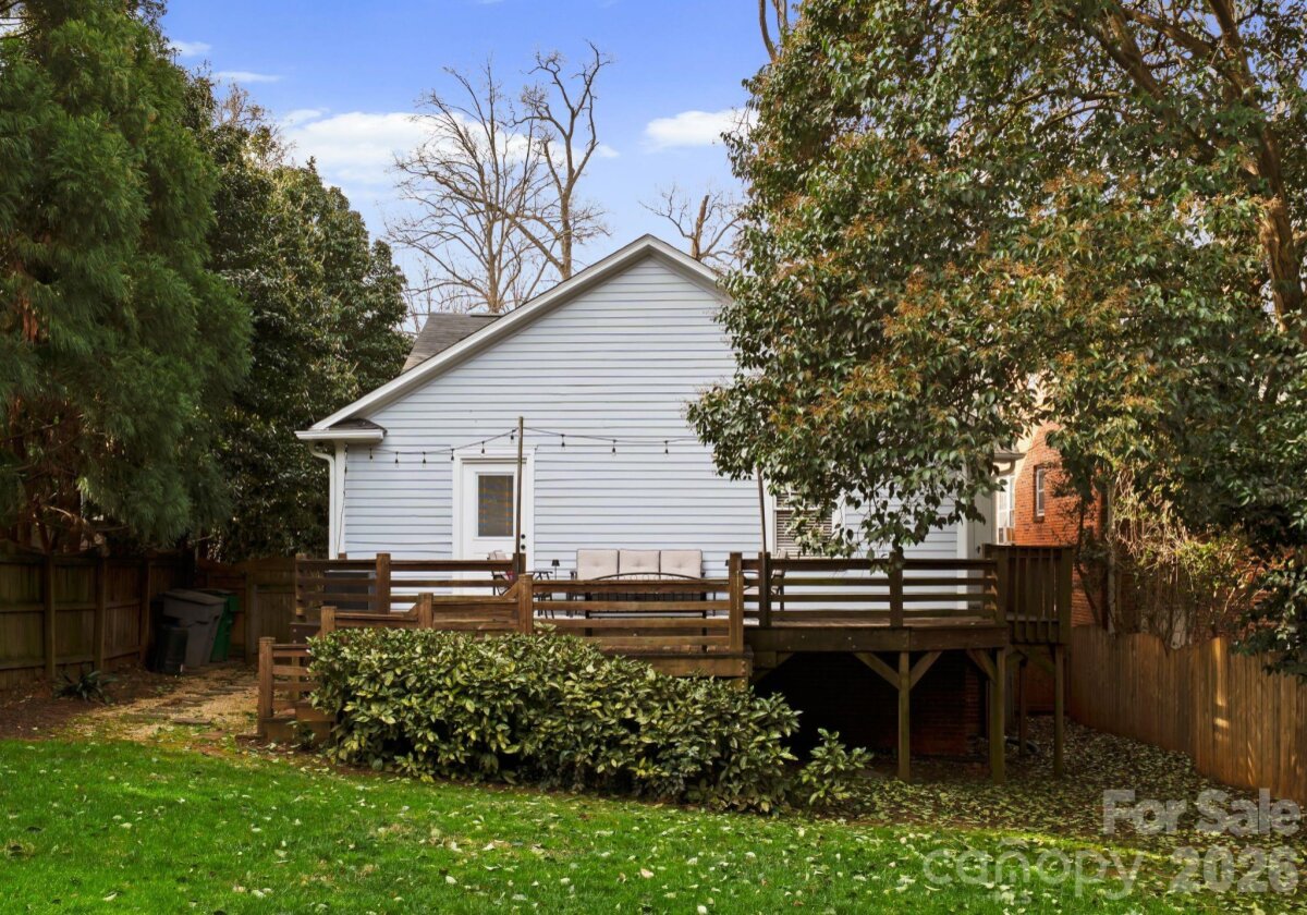 Adorable and whimsical 1928 bungalow perched perfectly in the heart of Dilworth, brimming with timeless character and undeniable curb appeal. From the inviting covered front porch with a bright pink front door, this home makes a memorable first impression. The freshly painted gray exterior highlights the home’s charming architectural details and classic 1920s character. Inside, original hardwood floors and original windows featuring "wavy glass" add to the vintage charm. The jewel-box décor highlights a classic black-and-white kitchen with built-ins and a cozy breakfast nook, while a beautiful mantle serves as the centerpiece of the bright, sun-filled living room. The living room, dining room, and kitchen flow seamlessly together, creating an ideal space for both everyday living and entertaining. The home offers three bedrooms—one currently used as an office and without a closet—along with one and a half baths, including a powder room full of personality. A tucked-away laundry closet and drop zone/pantry area add convenience, and a wooden deck overlooks the private, fenced backyard—perfect for relaxing or entertaining in one of Charlotte’s most beloved neighborhoods.