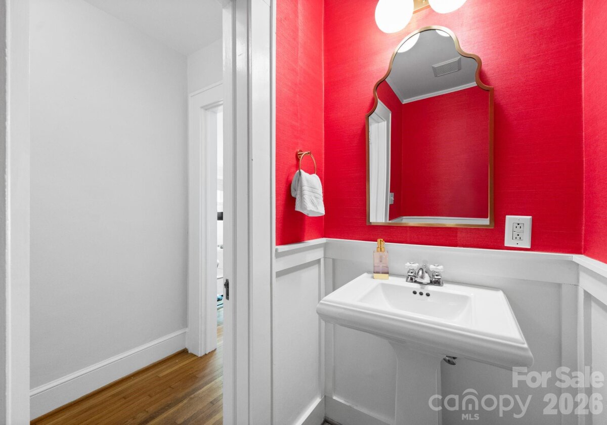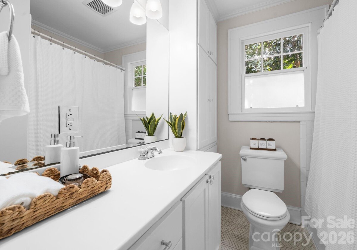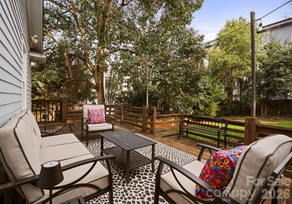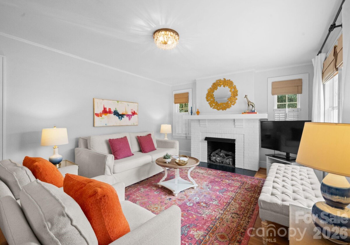 Adorable and whimsical 1928 bungalow perched perfectly in the heart of Dilworth, brimming with timeless character and undeniable curb appeal. From the inviting covered front porch with a bright pink front door, this home makes a memorable first impression. The freshly painted gray exterior highlights the home’s charming architectural details and classic 1920s character. Inside, original hardwood floors and original windows featuring "wavy glass" add to the vintage charm. The jewel-box décor highlights a classic black-and-white kitchen with built-ins and a cozy breakfast nook, while a beautiful mantle serves as the centerpiece of the bright, sun-filled living room. The living room, dining room, and kitchen flow seamlessly together, creating an ideal space for both everyday living and entertaining. The home offers three bedrooms—one currently used as an office and without a closet—along with one and a half baths, including a powder room full of personality. A tucked-away laundry closet and drop zone/pantry area add convenience, and a wooden deck overlooks the private, fenced backyard—perfect for relaxing or entertaining in one of Charlotte’s most beloved neighborhoods.